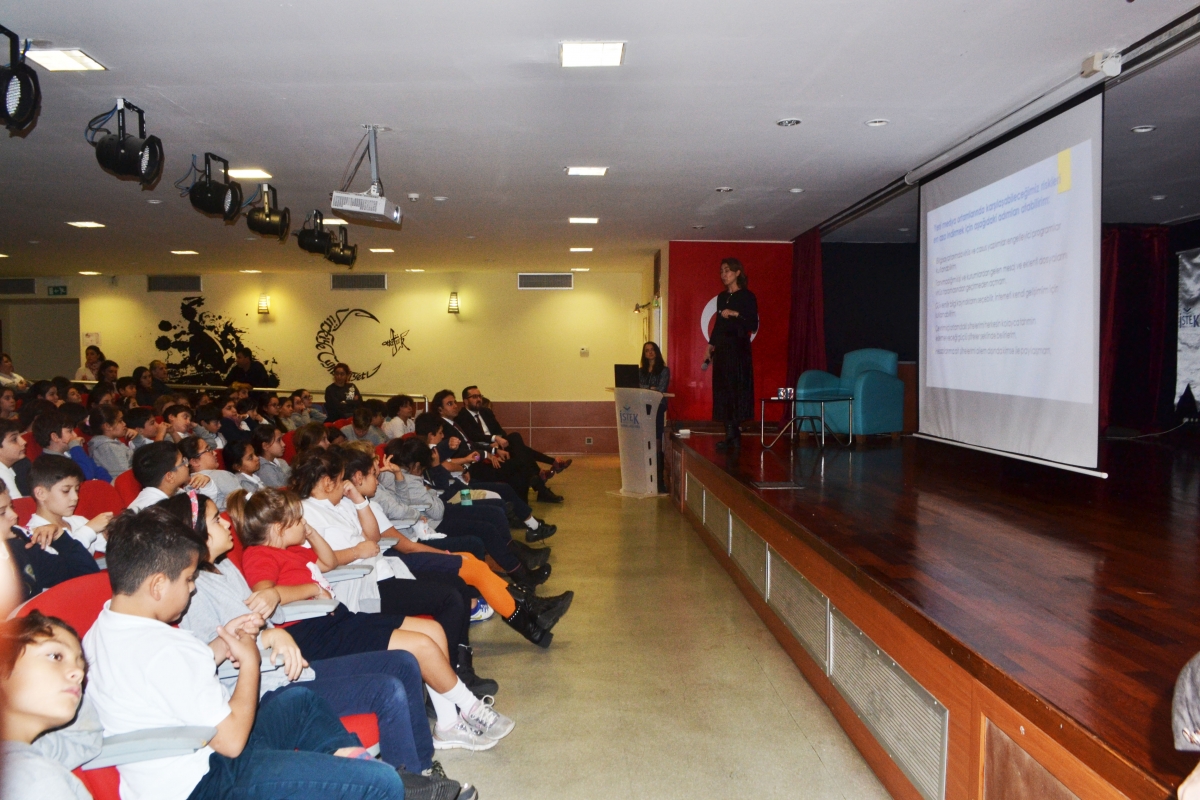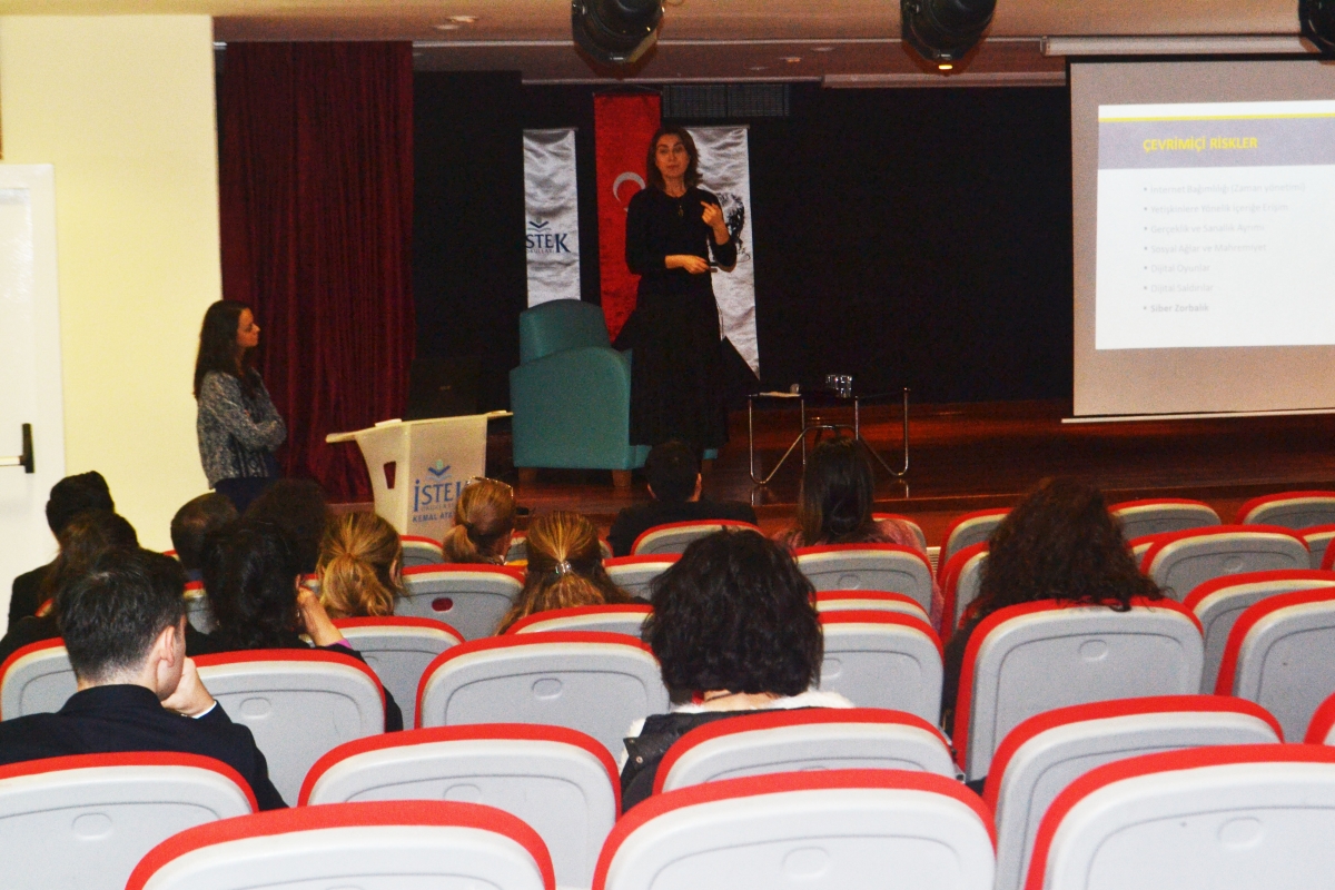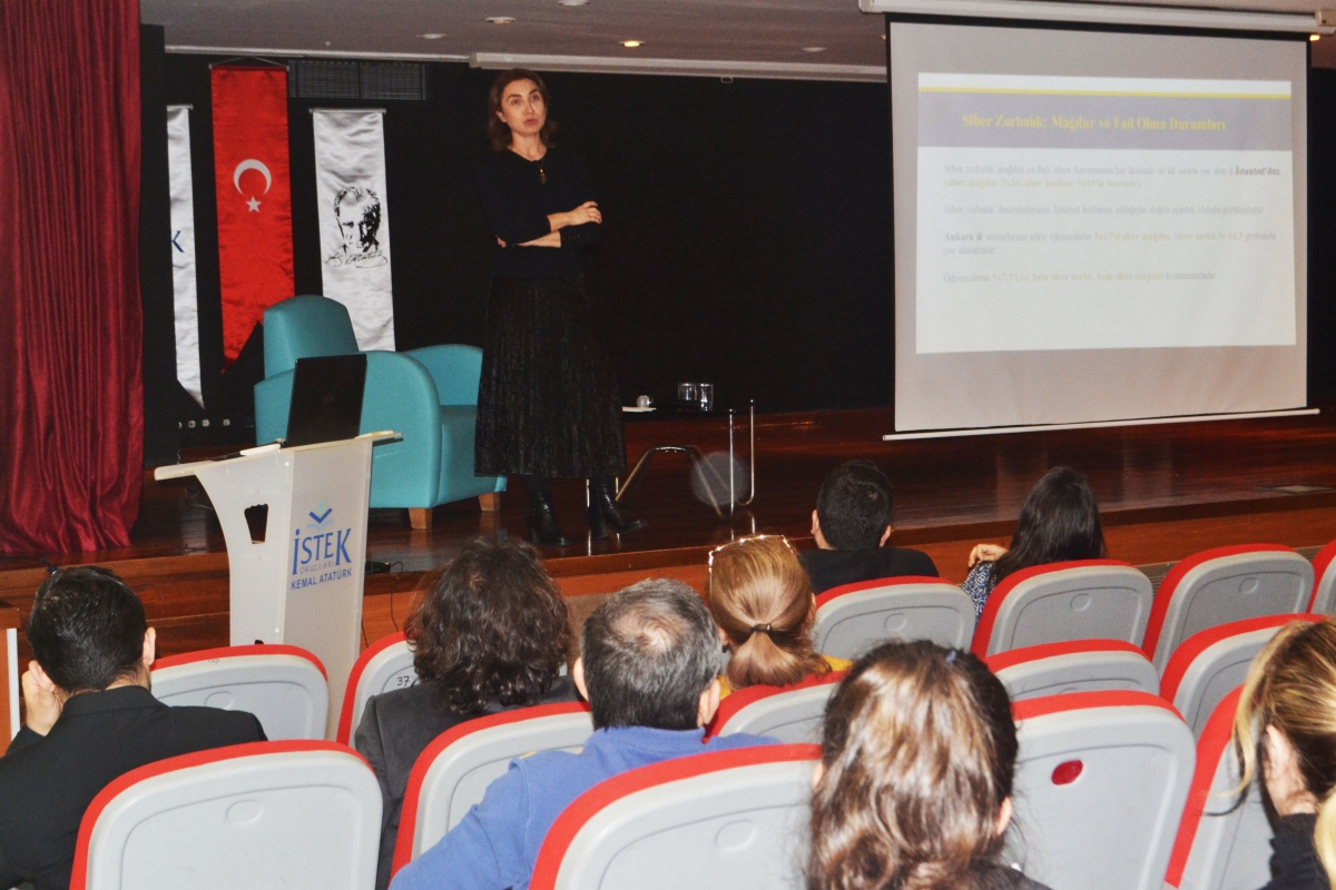 İSTEK Özel Kemal Atatürk Ortaokulu öğrencilerimizin ve velilerimizin “Siber Zorbalık” konusunda duyarlılığının artırılması amacıyla bir dizi etkinlik gerçekleştirdik. Bilgilendirme etkinliğimizde Kocaeli Üniversitesi İletişim Fakültesi Gazetecilik Bölüm Başkanı Prof. Dr. Emel Baştürk internetin doğru kullanımı, sanal dünyada çocukları bekleyen tehlikeler, siber zorbalıkla karşılaşıldığında yapılması gerekenler konusunda son derece bilgilendirici bir sunum gerçekleştirdi. Prof. Dr. Emel Baştürk, önce ortaokul öğrencilerimiz için hazırladığı sunumu okulumuzun konferans salonunda öğrencilerimizin de yoğun ilgisiyle yaparken, öğrencilerimiz de soruları ve yorumlarıyla sunuma katkıda bulundular. Özellikle siber zorbalıkla ilgili farkındalığı artırmayı amaçlayan klip izletildiğinde öğrencilerimizin coşkusu görülmeye değerdi. Prof. Dr. Emel Baştürk Akca da sunumu öğrencilerin yaş gruplarına uygun bir biçimde sürdürdü.